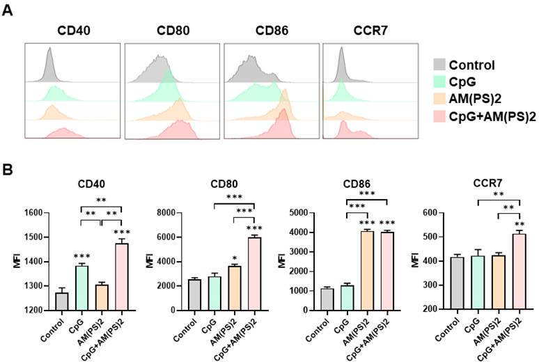 CpG-2722 and c-di-AM(PS)2 cooperatively promoted the activation of BMDCs. Mouse BMDCs were stimulated with CpG-2722 (5 μg/ml), c-di-AM(PS)2 (1 μg/ml), or a combination of both. After 24 h, cells were collected and analyzed the surface expression of CD11c, CD40, CD80, CD86, and CCR7 by flow cytometry. (A) Representative histograms were shown. (B) The MFI of CD40+, CD80+, CD86+, and CCR7+ cells in a population of CD11c+ cells were quantified. Data are the mean ± SEM (n = 4). *P < 0.05, **P < 0.01, and ***P < 0.001 compared with control cells or between the different groups as indicated. CpG and AM(PS)2 stand for CpG-2722 and 2'3'-c-di-AM(PS)2.