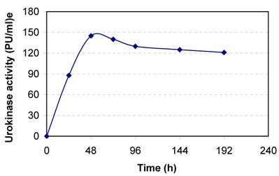 Enzyme assay: Amidolytic activity of urokinase was determined by the method of Tait et al. [17], using pyro-Glu-Gly-Arg-p-nitroanilide-HCl as urokinase substrate. The activity units were expressed as Plough units/mg protein and were determined by using urokinase from human kidney cells (0.37 Sigma units/mg protein; 1 Sigma unit = 75 000 Plough units) as standard. One Sigma unit corresponds to the amount of enzyme that hydrolyzes 1 μmol pyro-Glu-Gly-Arg-p-nitroanilide-HCl per minute at 37 ºC and at pH 8.8.