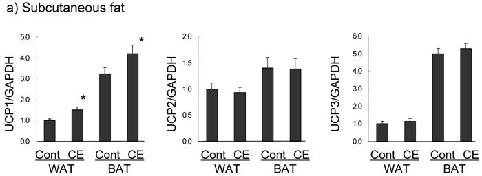 The efficacy of topical application suggested the applicability of CE to nutra-ceutical external agents that can alter regional fat accumulation. Since significant fat reduction was restricted to the applied region, being less effective for visceral and subcutaneous fat in other separated regions (data not shown), it was revealed that CE can be transdermaly absorbed and it directly affects the metabolism of subcutaneous fat. Interestingly, the repeated application of CE markedly up-regulated UCP3 in the superficial skin, and significantly increased UCP1 mRNA in subcutaneous WAT and BAT, suggesting that regional subcutaneous fat reduction was induced by CE due to not only transient lipolysis promotion but also the activation of UCP.