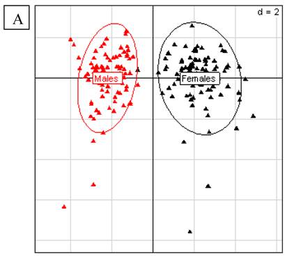 A. Principal Component Analysis for liver parameters in all rats of the MON 863 experiment. It was performed according to Hotelling [29] in order to study the scattering of the different factors. The scheme obtained for parameters at week 14 explains 42.42% of the total data variability (inertia) expressed on 2 axes (32.01% for factor 1; 10.41% for factor 2), scale d=2. This demonstrates the clear separation of parameters values according to sex. B. Principal Component Analysis for kidney parameters in all rats of the MON 863 experiment. The scheme obtained for parameters at week 14 explains 47.73% of the total data variability (inertia) expressed on 2 axes (26.95% for factor 1; 20.78% for factor 2), scale d=5. This demonstrates the clear separation of parameters values according to sex.