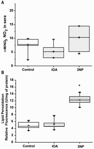 Statistical Analysis: Damage induced by 3-NP treatment in mice varies from mouse to mouse; also there are no studies carried out in vivo analyzing striatal damage in the presence of low doses of IOA [30], then to visualize all data distribution with our experimental conditions, data are presented in box plots unless otherwise indicated. Experiments on data normally distributed were compared using ANOVA followed by Bonferroni post hoc tests. Kruskall-Wallis One Way Analysis Of Variance followed by Dunnet post hoc comparisons were used if the normality test failed. The statistical analysis was conducted using SigmaStat statistical software for Windows, version 2.03 (Systat Software, Inc.) and p<0.05 was considered to be statistically significant.