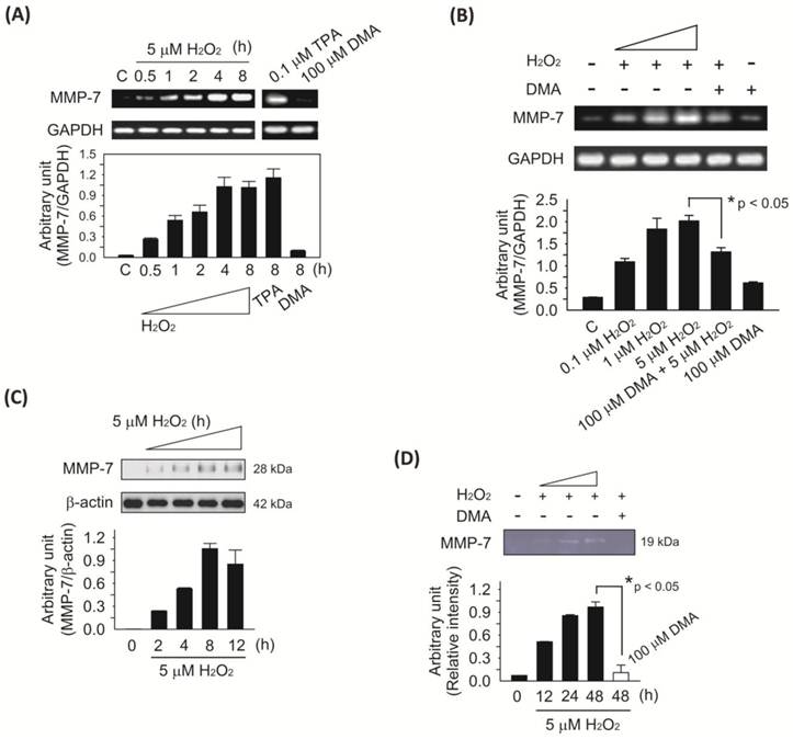 Effect of H2O2 on MMP-7 activation and expression in SW620 cells. A, H2O2 induced MMP-7 mRNA expression in a time-dependent manner. RT-PCR analysis demonstrated that non-lethal H2O2 levels (5 μM) immediately induced MMP-7 mRNA expression that plateaued at 4 h. TPA was used as a positive control for DMA. B, H2O2-induced dose-dependent increase of MMP-7 mRNA expression. SW620 cells were treated with H2O2 at the indicated doses for 4 h. RT-PCR products of MMP-7 after H2O2 treatment increased in a dose-dependent manner. Cells were pretreated with DMA (100 μM) for 30 min followed by incubation for additional 4 h in the absence or presence of H2O2 (5 μM). The densitometry graph shows that DMA (100 μM) pretreatment induced a significant reduction in MMP-7 mRNA expression compared to that of H2O2 (5 μM) treatment only (*p < 0.05). C, Western blot analyses showed that H2O2 (5 μM) induced MMP-7 secretion in a time-dependent manner. Whole cell lysates were immunoblotted with β-actin antibody for the normalization of cell numbers. D, casein zymogram showing the presence of MMP-7 in SW620 cells after H2O2 (5 μM) treatment for the indicated time. Areas of casein substrate cleared by MMP-7 were seen in H2O2 (5 μM)-treated samples but declined in the presence of DMA (100 μM). The casein zymographic analysis plots were performed using lytic bands normalized for protein concentration. DMA pretreatment (open bar) in the presence of H2O2 (5 μM) for 48 h significantly suppressed the caseinolytic activity compared to H2O2 (5 μM) treatment only (*p < 0.05). All experiments from three independent experiments are plotted. Columns represent the mean ± SD.