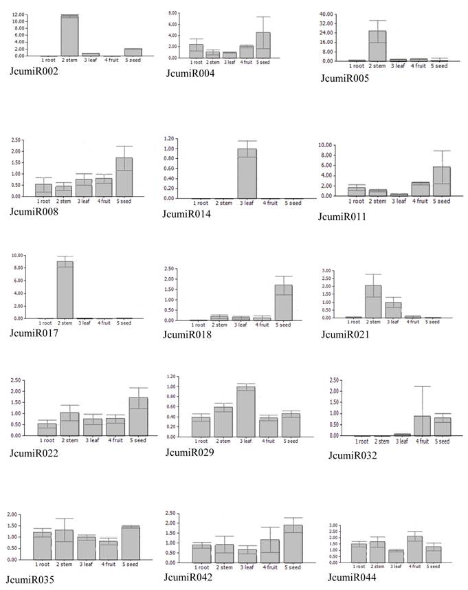 Expressions of 15 primary JcumiRNAs in different tissues. The 18S rRNA was selected as a control. 1: root, 2: stem, 3: leaf, 4: fruit and 5: seed.