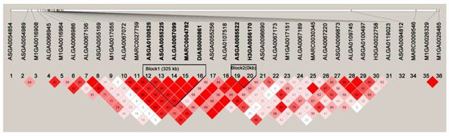 Haplotype block detection was performed on the chromosomal region which contained all the SNPs that were significantly associated with meat quality traits. The genotypes of those significant SNPs loci for 454 F2 individuals and their parents (55 F1 individuals) were used to detect the haplotype blocks. The HAPLOVIEW V3.31 program [22] was used to detect and visualize the haplotype blocks in this work. The procedure was run with default parameters following the manual for HAPLOVIEW program [22].