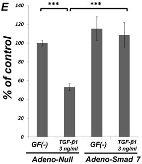 As shown in Figure 1A, TGF-β1 dose-dependently inhibited the growth of SCDC2 cells. The maximum growth inhibitory effects of TGF-β1 were observed at concentrations of 0.3-3 ng/mL. The TGF-β receptor inhibitor SB-431542 (10 μM), which inhibits TGF-β- and activin-induced phosphorylation of Smad2 but not BMP-induced phosphorylation of Smad1 [28], suppressed TGF-β1-induced growth inhibition. In addition, western blotting showed that Smad2 phosphorylation was upregulated at 1 h after treatment with 10 ng/mL TGF-β1 (Figure 1B). Moreover, TGF-β1-induced Smad2 phosphorylation was suppressed by treatment with the SB-431542 (10 μM). In order to examine how Smad7, which is an inhibitor for the TGF-β1-induced Smad-dependent intracellular signaling, affects TGF-β1-induced growth inhibitory activity in SCDC2 cells, the cells were transfected with adenoviral expression vector for Smad7. Figure 1C depicts the expression of FLAG-tagged Smad7 protein in the Adeno-Smad7 transfectants. In addition, overexpression of Smad7 significantly but not completely suppressed TGF-β1-induced phosphorylation of Smad2 in SCDC2 cells (Figure 1D). Intriguingly, Smad7 clearly suppressed the TGF-β1-induced growth inhibition (Figure 1E). In contrast, the p38 MAPK-specific inhibitor SB 203580 (30 μM) did not suppress the TGF-β1-induced growth inhibition (Figure 1A), whereas it was confirmed that TGF-β induced the phosphorylation of p38 MAPK as shown in Figure 4A. These results strongly suggested that the TGF-β1-induced growth inhibition of ligament-derived EPC-like fibroblastic cells was mainly mediated by the Smad-dependent signal, but not mediated by p38 MAPK-dependent signal.