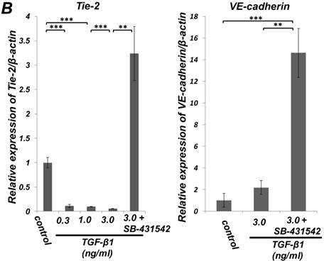 Total RNA from SCDC2 cells was isolated with ISOGEN reagent (Nippon Gene, Toyama, Japan) according to the manufacturer's instructions. First-strand cDNA was synthesized from total RNA using the PrimeScript RT reagent Kit (Takara-Bio, Shiga, Japan). qRT-PCR was performed on a Thermal Cycler Dice Real Time System (Takara-Bio) using SYBR Premix Ex Taq II (Takara-Bio) with specific oligonucleotide primers (Table 1). The mRNA expression levels of Tie-2, VE-cadherin, α-SMA, h1-calponin, SM22α, Smad6 and Smad7 were normalized to that of β-actin, and the relative expression levels were shown as fold increase or decrease relative to the control.