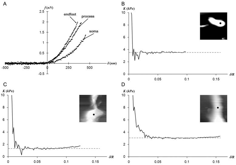 (a) The representative f-d extension curves obtained from points closer to three different regions of a Müller cell. The obtained data (dots) fit well with the Hertz model (solid lines).While the f-d curves obtained from the endfoot and process resemble each other, the one obtained from the soma deviates from other curves. The elastic constant (K) - indentation (δ) curves corresponding to data presented in (a) were presented in (b) for endfoot, (c) for soma, and (d) for process. The insets are the AFM deflection images (25 μm × 25 μm) obtained from the AFM contact mode imaging from each region. The f-d curve measurement point was shown as a dot in the inset. The plateau of K implies a mechanically linear and homogeneous behavior of Müller cells in the vertical direction.