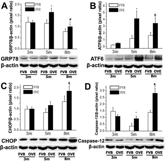 (A-D) The expression of GRP78, ATF6, CHOP and caspase-12 were detected by Western blotting assay. Data are presented as mean ± SD. m: mouse age in months. OVE: OVE26. * P<0.05 compared to FVB controls. & P <0.05 compared to OVE26 mice aged 3 month. # P <0.05 compared to OVE mice aged 5 month.