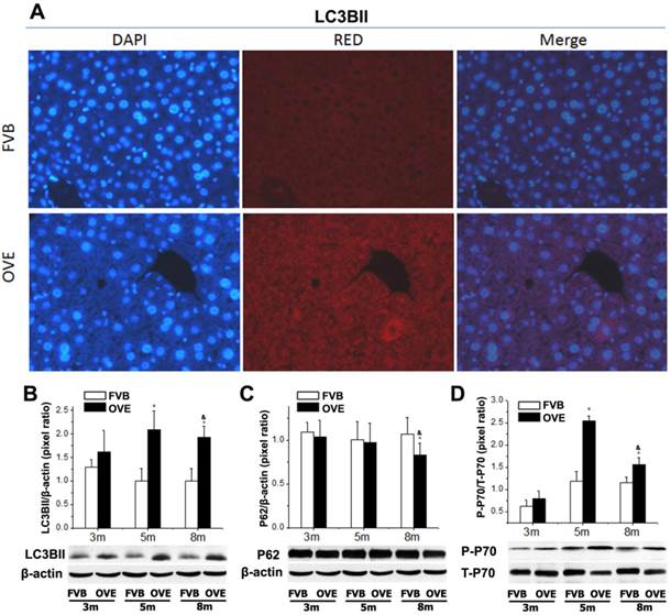 (A) The images of immunofluorescent staining for detection of LC3BII expression. (B-D) The expressions of LC3BII, P62, T-p70 and P-P70 were detected by Western blotting assay. Data are presented as mean ± SD. m: mouse age in months. OVE: OVE26. P-p70: phospho-p70 S6 Kinase; T-p70: total p70 S6 kinase. * P<0.05 compared to FVB controls. & P <0.05 compared to OVE26 mice aged 3 month.