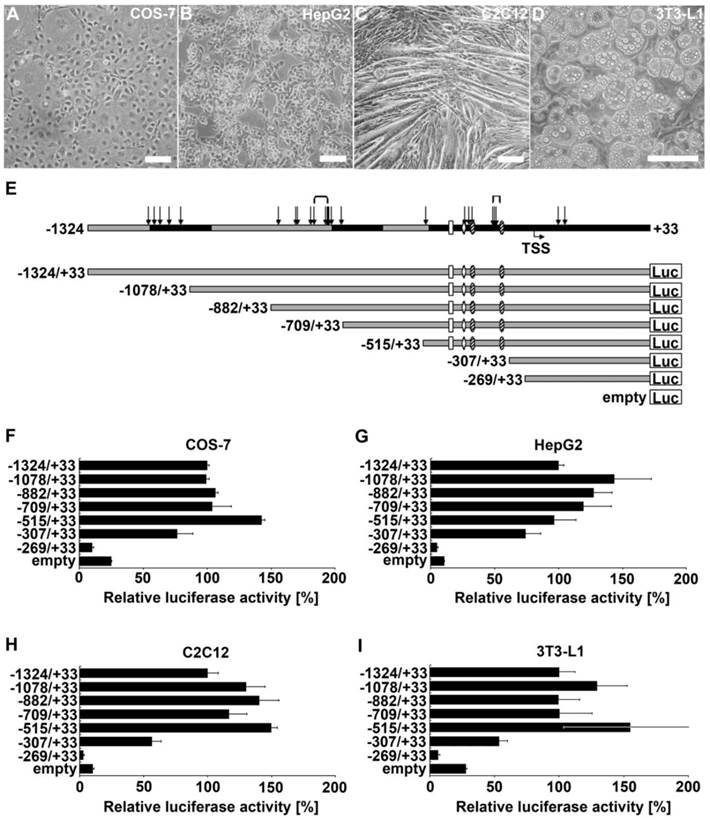 COS-7 cells were cultured in Dulbecco's Modified Eagle's medium (DMEM) containing GlutaMAX-I, 1 g/L D-glucose, and sodium pyruvate (Life Technologies, Darmstadt, Germany) supplemented with 10% fetal bovine serum (FBS), 100 U/mL penicillin and 100 µg/mL streptomycin (all from PAA, Cölbe, Germany). HepG2, C2C12, and 3T3-L1 cells were cultured in DMEM containing L-glutamine, 4.5 g/L D-glucose, and sodium pyruvate (Life Technologies) supplemented with 10% FBS, 100 U/mL penicillin, and 100 µg/mL streptomycin. C2C12 cells were induced to differentiation upon 80% confluence by serum withdrawal (DMEM with 2% horse serum; PAA) for seven days. 3T3-L1 cells were differentiated as follows: two days after cells reached 80% confluency, adipocyte differentiation was initiated by treatment with growth medium containing 10 μg/mL insulin, 1 μM dexamethasone, and 0.5 mM isobutylmethylxanthine (all from Sigma-Aldrich, Steinheim, Germany) for two days. Cells were then treated with growth medium containing 10 μg/mL insulin for two days. Cells were then maintained in regular growth medium (DMEM/10% FBS) for an additional four days. Differentiation was achieved by day eight. Cell incubation was performed at 37 °C in a humidified 5% CO2 atmosphere.