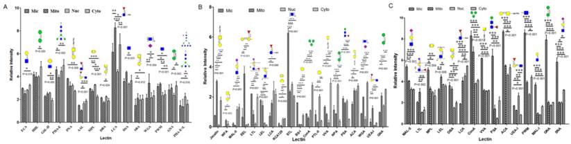 Lectin microarray analysis of glycopattern differences in subcellular fractions Mic, Mito, Nuc, and Cyto of three bladder cells. (A) Relative fluorescence intensities of 15 differentially expressed lectins in YTS1 cell. (B) Relative fluorescence intensities of 19 differentially expressed lectins in KK47 cell. (C) Relative fluorescence intensities of 15 differentially expressed lectins in HCV29 cell. *p< 0.05; **p< 0.01; ***p< 0.001.