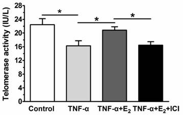 Senescent cells often have decreased telomerase activity. Figure 4 shows that TNF-α significantly decreased the telomerase activity of the NP cells compared to the control group, whereas E2 significantly increased the telomerase activity of the TNF-α-treated NP cells. When the ER function was antagonized by ICI 182780, the telomerase activity of the E2-treated NP cells was markedly decreased. These results demonstrated that TNF-α E2 can significantly decrease the telomerase activity of TNF-α-treated NP cells through ER function.