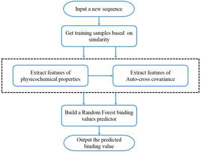 We present the first computational method of MMPs peptide-binding specificity identification. For each MMP, we have 1400 peptide motifs with experimental binding affinity values, treated as known in this study. To identify binding values of 4400 peptide sequences binding to seven MMPs, we firstly propose a sampling criteria to construct an affinity-based training set for each peptide motif. Then we select 9 physicochemical properties of amino acids to describe each peptide motif. We also use auto-cross covariance to extract correlative properties of amino acids in any two positions. Finally, we consider Random Forest to predict affinity values of peptide motifs. The method is shown in Figure 1.