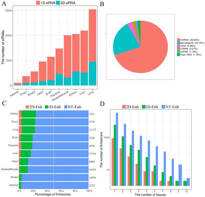 The statistics of eRNA and three types of enhancers in each tissue. (A) The number of 1D-eRNAs and 2D-eRNAs across 10 tissues. (B) The proportion of eRNAs assigned to known RNA categories based on the GENCODE(V19). (C) Proportions and numbers of 2D-Enh, 1D-Enh and NT-Enh in 10 tissues. The total number of enhancers in each tissue is listed to the right of each bar. (D) The number of 2D-Enh, 1D-Enh and NT-Enh across 1-10 tissues.