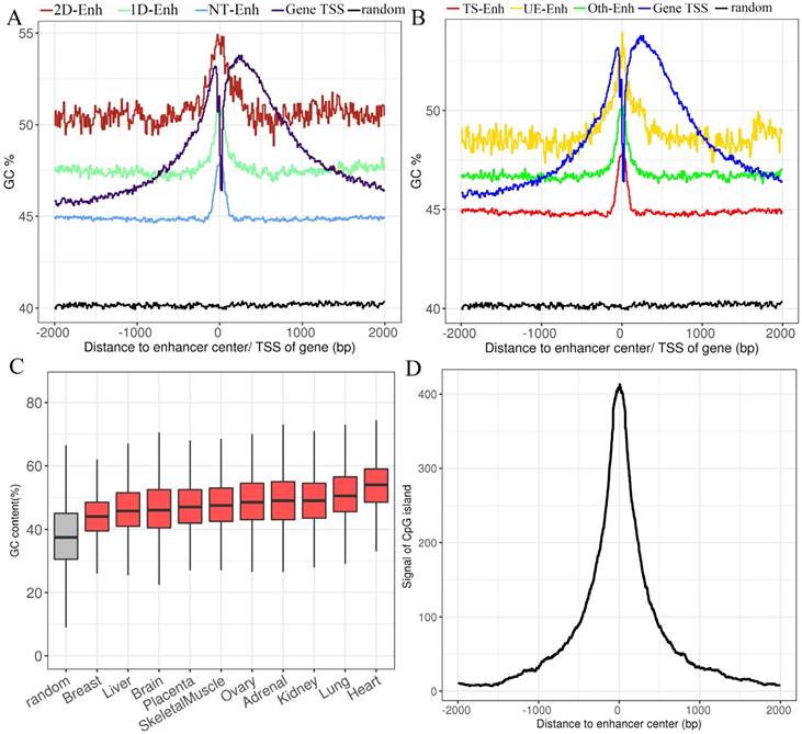 The GC content of enhancers in ±2 kb from enhancer center. (A) The mean GC content for 2D-Enh, 1D-Enh, NT-Enh, gene TSS and the random region within a 2-kb window around the center of enhancer. (B) The mean GC content for TS-Enh, UE-Enh, Oth-Enh, gene TSS and the random region within ±2 kb around the enhancer center. (C) The GC content of the enhancers in 10 tissues. (D) Distribution of CpG island located on enhancers. Y-axis represents the coverage of the CpG island of each enhancer.