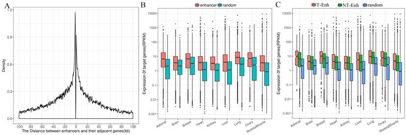 Distribution of adjacent coding genes around enhancers center and the expression levels of target genes. (A) Distance between enhancers and adjacent protein-coding target genes. (B) Comparative expression levels of the target genes of the enhancers and random regions. (C) Comparative expression levels of the target genes among the T-Enh, NT-Enh and random regions.
