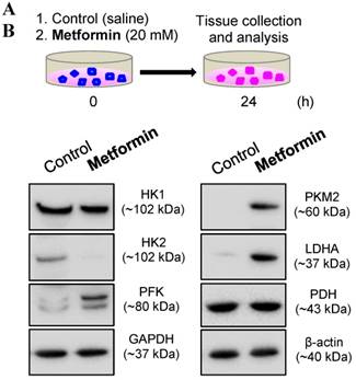 (A) Schematic of the in vitro experimental procedure. (B) Effects of metformin on the protein levels of the major glycolytic enzymes in cultured human endometrial tissues. Endometrial biopsy samples from PCOS patients with endometrial hyperplasia were treated with saline or 20 mM metformin for 24 h. Endometrial tissue lysates were directly immunoblotted with antibodies against HK1, HK2, PFK, GAPDH, PKM2, LDHA, and PDH as indicated. β-actin and gels stained with Coomassie blue (data not shown) served as loading controls. Representative images (n = 2 patients/group) from two independent experiments with identical results are shown.