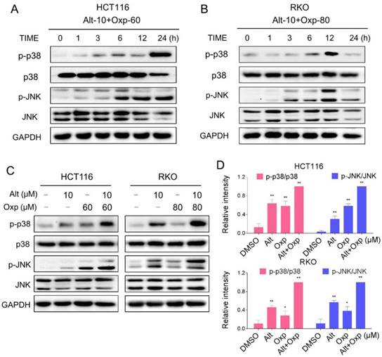 Oxaliplatin and ALT combination activated JNK and p38 MAPK signaling pathways. (A-B) HCT116 or RKO cells were treated with oxaliplatin and ALT combination for the indicated times, the protein levels of p-p38, p38, p-JNK and JNK were determined by western blot. (C-D) HCT116 or RKO cells were treated with oxaliplatin or ALT alone or their combination at the indicated doses. The protein levels of p-p38, p38, p-JNK and JNK were determined by western blot. Data represent similar results from three independent experiments (* p< 0.05, ** p < 0.01).