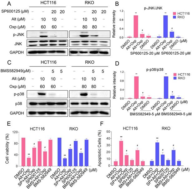 In order to identify the role of the JNK and p38 MAPK pathways in the combined treatment-induced cell apoptosis, the HCT116 and RKO cells were co-treated with oxaliplatin and ALT after pretreatment with JNK inhibitor SP600125 or p38 inhibitor BMS-582949. We found that pretreatment with SP600125 or BMS-582949 markedly reversed the combined treatment-induced phosphorylation of JNK or p38 in HCT116 and RKO cells (Figure 4A-4D). Moreover, the results in Figure 4E-4F showed that SP600125 or BMS-582949 can partially attenuate combined treatment-induced cell growth inhibition and apoptosis, suggesting that the activation of JNK and p38 signaling pathways is essential for the lethality of the combined treatment.
