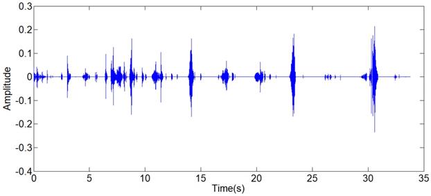 Influenced by the environment factors, device factors and physical factors, the noise of lung sounds collected is concentrated in the low-frequency and high frequency. To eliminate the main part of low-frequency and high-frequency noises, we choose a type I Chebyshev band-pass filter for ensuring a steep roll-off frequency. The frequency spectrum (see Fig 3.b) shows that the frequency of original signals varies from 0Hz to 500Hz. For retaining the whole frequency domain of the lung sounds, the pass-band of FIR filter is set from 15Hz to 1700Hz. The output of the filter is shown in Fig 4.