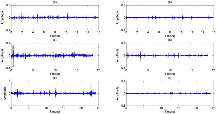 (a),(c),(e) Another three typical respiratory sounds, (b),(d),(f) The filtered signals of the three signals