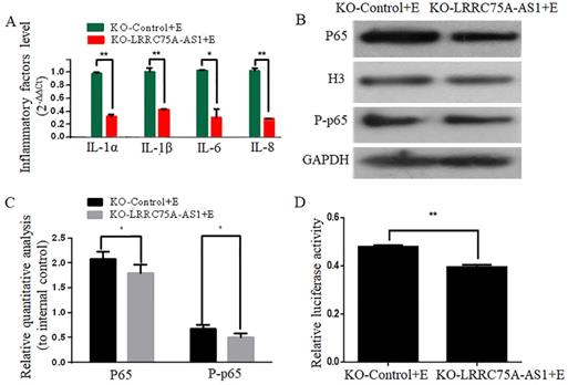 KO of LRRC75A-AS1 attenuated the activation of inflammation. (A) Inflammatory factors were detected by RT-qPCR. (B) Western blot on nuclear NF-κB subunit p65 and total phosphorylated p65 was performed to detect the activation of NF-κB pathway. (C) Relative quantitative analysis was performed. H3 was used as control in nucleus. GAPDH was regarded as control in cytoplasm. (D) The activation of NF-κB pathway was tested by dual luciferase reporter gene assay.