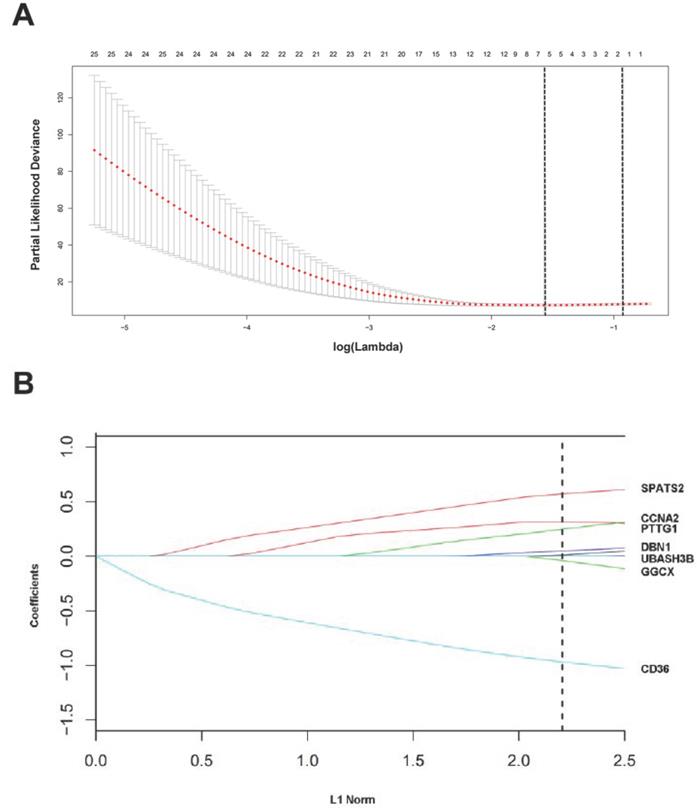 The “glmnet” package [13, 20] returned a sequence of models for us (Figure S3A), and 10-fold cross-validations were performed to select the best one. As shown in Figure 3A, a value λ = 0.20770 with log (λ) = -0.68256 was chosen by 10-fold cross-validation via minimum criteria. However, the results of the λ value might be slightly variable during different times of analysis. So, 10-fold cross-validation was running up to 100 times and the cross-validated errors were averaged. Finally, the λ with minimum mean cross validation error was still returned about 0.20770. At this λ value, 7 mRNAs including CD36, GGCX, UBASH3B, DBN1, PTTG1, CCNA2 and SPATS2 with nonzero coefficients were selected (Figure 3B). Among them, CD36 and GGCX were down-regulated in CCA, and the other 5 genes were up-regulated. Meanwhile, person's correlation tests showed that the expression of these 7 genes was independent of each other (Figure S3B). Based on the expression status of these 7 mRNAs, a risk-score formula for RFS was constructed as follows: Risk score= (-0.96873 × expression status of CD36) + (-0.03944 × expression status of GGCX) + (0.01064 × expression status of UBASH3B) + (0.04955 × expression status of DBN1) + (0.24927 × expression status of PTTG1) + (0.31598 × expression status of CCNA2) + (0.57201 × expression status of SPATS2). In the formula, low expression status was equivalent to 0, and high expression status was equivalent to 1.