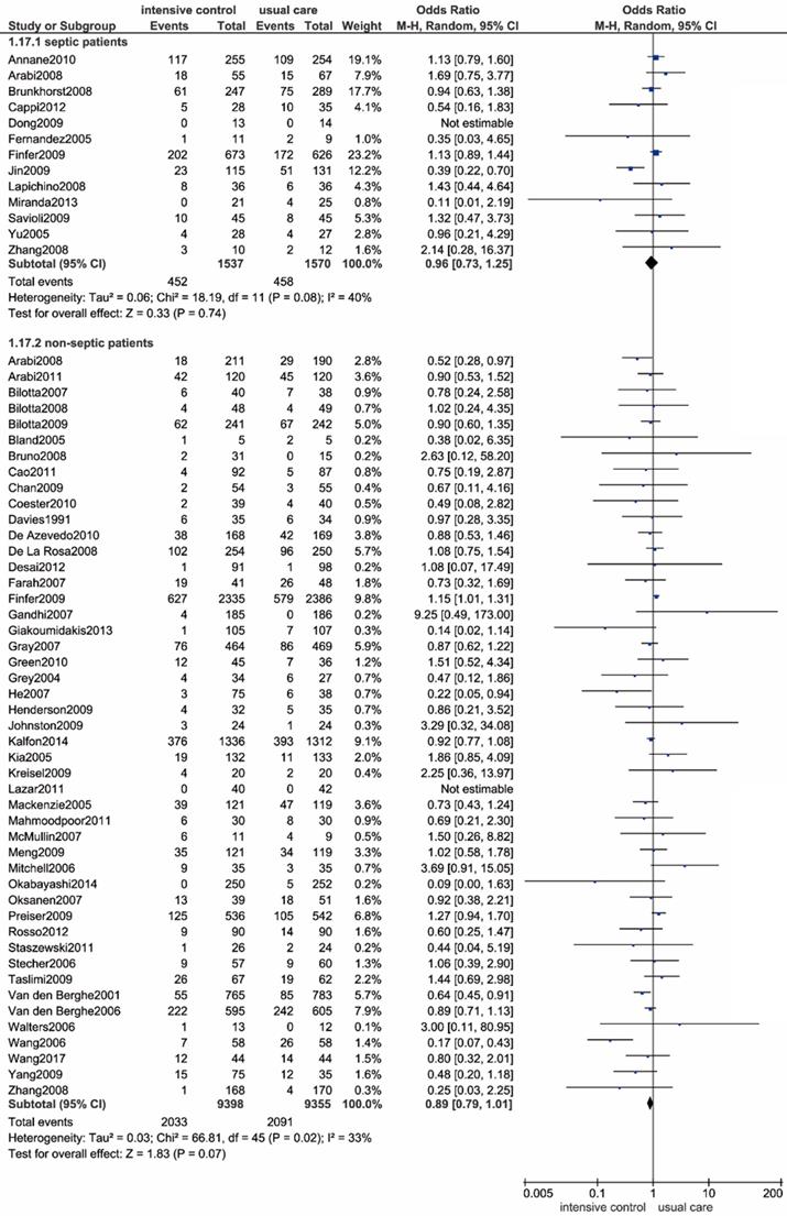 Insulin infusion in various clinical settings may be different due to its particular pathophysiologic characteristics. Therefore, we performed subgroup analyses by categorizing trials into septic ICU settings to address the discrepancy of insulin therapy among patients diagnosed with sepsis or septic shock.