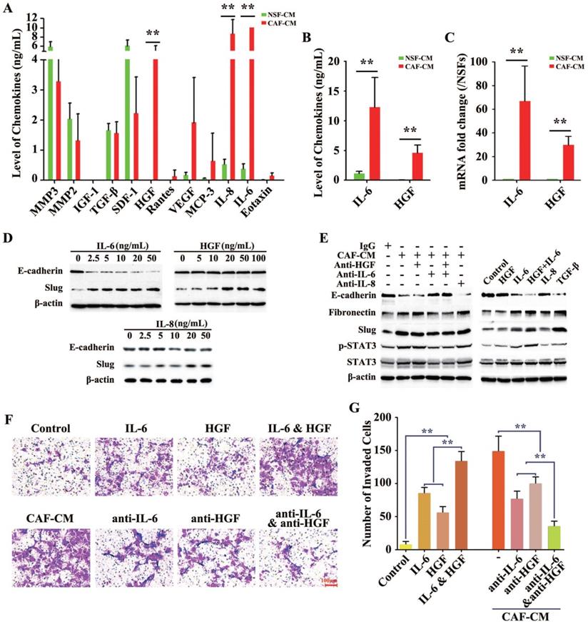 The previous results indicated that certain molecules in the CAF-CM but not in the NSF-CM acted as the EMT-inducer. The concentrations of a total of 72 cytokines and chemokines were further measured in the CAF-CM and NSF-CM by secretomic assay using a suspension array system. The levels of several inflammatory cytokines and growth factors including IL-6, IL-8, monocyte chemoattractant protein 3 (MCP-3), vascular endothelial growth factor (VEGF), and HGF were significantly higher in the CAF-CM than in the NSF-CM, and IL-6, IL-8, and HGF were the most dramatically elevated, with the IL-6 level in the CAF-CM exceeding the examinable threshold (Figure 3A). Furthermore, ELISA (Figure 3B) and RT-PCR (Figure 3C) were performed to measure the protein and gene levels of IL-6 and HGF in the CMs, and showed results consistent with those of the secretomic assay.