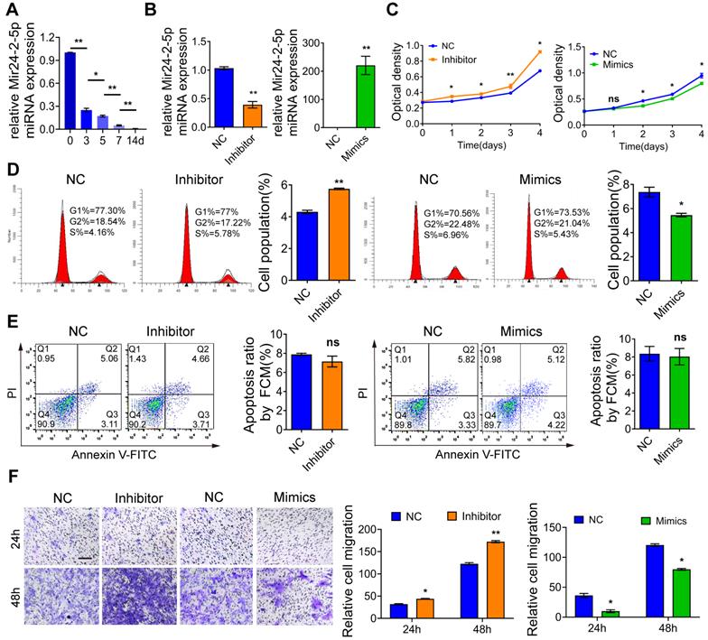 Mir24-2-5p negatively regulates osteoblast precursor cells cellular proliferation and migration. (A) Expression of Mir24-2-5p determined by qRT-PCR at day 0, 3, 5, 7, and 14 of osteogenic differentiation of osteoblast precursor cells. n=5. (B) Expression of Mir24-2-5p determined by qRT-PCR after transfection of Mir24-2-5p Inhibitor and Mir24-2-5p Mimics. n=4. (C) CCK-8 assay over the course of 4 days. n=4. (D) Cell cycle analysis performed by flow cytometry in Inhibitor and Mimics groups. n=4. (E) Apoptosis analysis performed by flow cytometry. n=4. (F) Transwell migration assay testing of osteoblast precursor cells at 24 and 48 hours in Inhibitor and Mimics groups. Bar = 100 μm. n=4. Data expressed as mean ± S.E.M. *p < 0.05, **p < 0.01, ns, not significant.