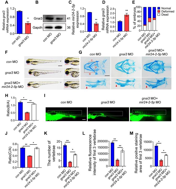 mir24-2-5p inhibits osteogenic differentiation by targeting gnai3 in zebrafish embryos. (A) gnai3 mRNA knockdown efficiency in the gnai3 MO embryos confirmed by qRT-PCR. MO: morpholino. n=6. (B) The expression level of Gnai3 protein in the gnai3 MO embryos detected by Western blotting. (C) The expression level of mir24-2-5p in mir24-2-5p MO embryos detected by qRT-PCR. n=6. (D) The expression level of gnai3 mRNA in mir24-2-5p MO embryos detected by qRT-PCR. n=6. (E) Statistics of mortality and malformation rate in zebrafish embryos injected with gnai3 MO and co-injected with gnai3 MO + mir24-2-5p MO. n = 6. (F) Bright-field images of zebrafish embryos injected with gnai3 MO and co-injected with gnai3 MO + mir24-2-5p MO. at 96 hpf. hpf, hours post-fertilization. Red dotted line: mandible. Bar = 500 μm. (G) Ventral (upper row) and lateral view (lower row) of con MO, gnai3 MO and gnai3 MO + mir24-2-5p MO embryos by Alcian blue staining at 120 hpf. Red arrow, Meckel's cartilage. Bar = 100 μm. (H-I) Quantification of the ratio of B/A or C/A of Alcian blue staining. n=6. (J) Visualization of calcified skeletal structures in con MO, gnai3 MO and gnai3 MO + mir24-2-5p MO embryos at 9 dpf by calcein staining. dpf, days post-fertilization. Bar = 200 μm. (K-M) The quantification of calcein staining. n=6. Data expressed as mean ± S.E.M. *p < 0.05, **p < 0.01.