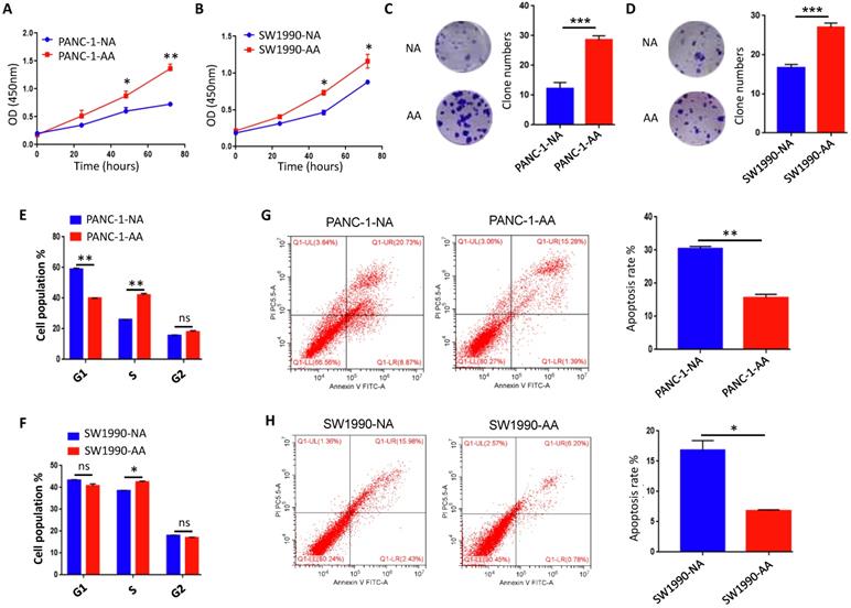 Proliferation was increased in acidosis-adapted PDAC cell. (A & B) CCK8 assays showed cell proliferation in PANC-1-AA/NA and SW1990-AA/NA cells. (C & D) Effects of acidic environment on the clonogenicity of PANC-1 and SW1990 cells. (E & F) Summary data of cell cycle analysis by flow cytometry in acidosis-adapted PDAC cells and control cells. (G & H) Cell apoptosis analysis by flow cytometry in acidosis-adapted PDAC cells and control cells (left) and summary data (right). *, P<0.05; **, P<0.01; ***, P<0.001; ns, no significant difference; N=3.