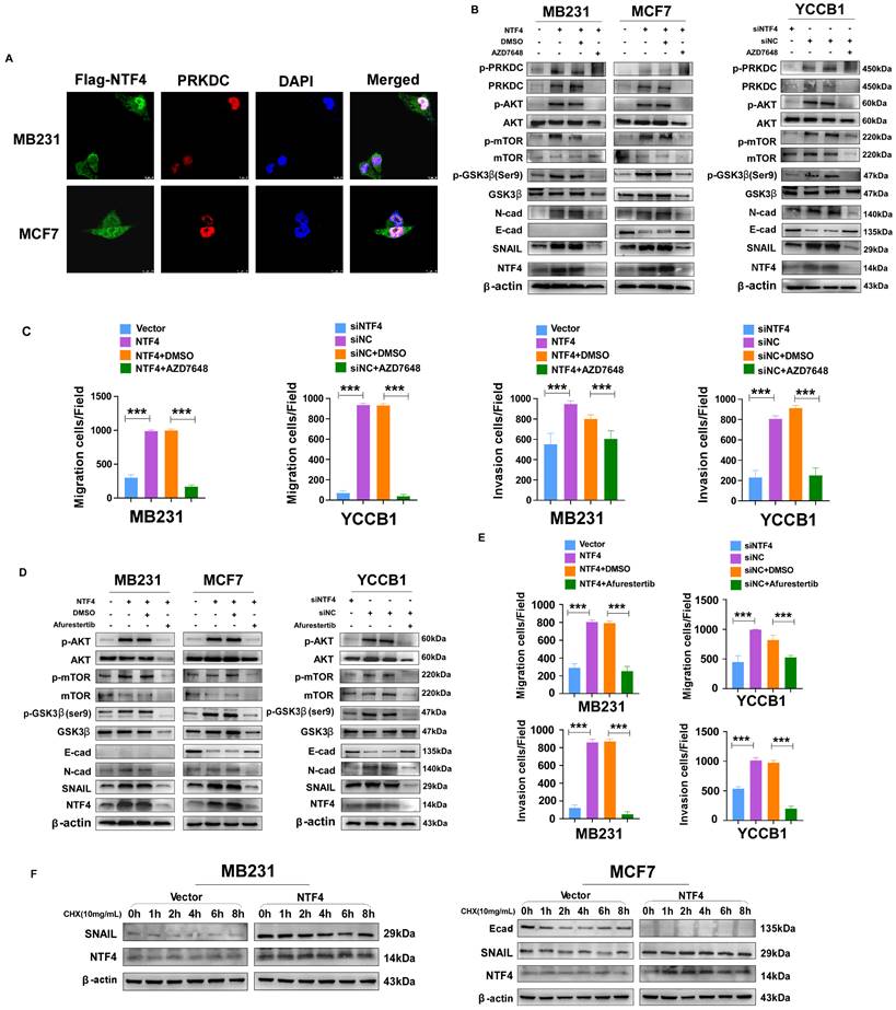 NTF4 activates PRKDC/AKT pathway and promote GSK-3β- dependent SNAIL stability. (A) Imunofluorescence staining of Flag and PRKDC in MDA-MB-231 and MCF7 cells stably expressing vector and Flag-NTF4. (B-C) MDA-MB-231 cells stably expressing vector and Flag-NTF4 or YCCB1 cells transfected transiently with siNC and siNTF4 were treated with or without 10μM PRKDC inhibitor AZD7648 for 24h and analyzed by immunoblotting (B), migration assays and matrigel-coated invasion assays (C). (D-E) MDA-MB-231 cells stably expressing vector and Flag-NTF4 or YCCB1 cells transfected transiently with siNC and siNTF4 were treated with or without 30μM AKT inhibitor Afurestertib for 24h and analyzed by immunoblotting (D), migration assays and matrigel-coated invasion assays (E). (F) MDA-MB-231 and MCF7 cells stably expressing vector and Flag-NTF4 were treated with 100μg/mL of CHX for the indicated times and then analyzed by immunoblotting.