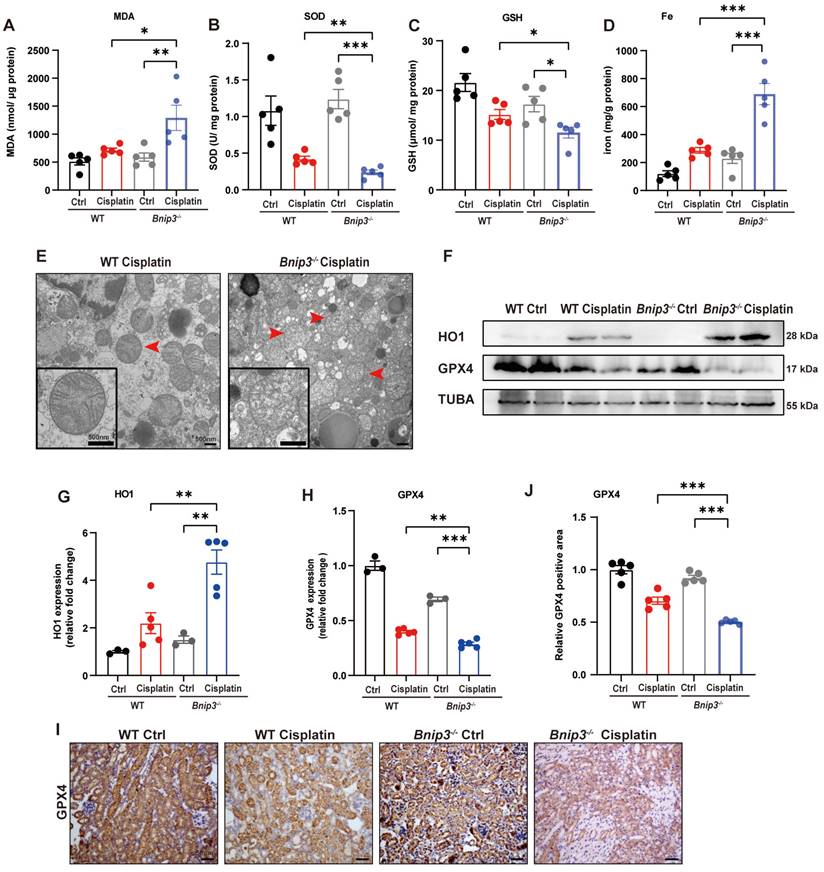 Cisplatin-induced ROS, lipid peroxidation and RTEC ferroptosis are increased in Bnip3 knockout kidneys. (A, B) ROS were evaluated by MDA and SOD levels in WT and Bnip3 knockout mice intraperitoneally injected with cisplatin. (C, D) Glutathione and iron levels in renal homogenate. (E) Representative EM image of mitochondrial injury in renal tubular epithelial cells of cisplatin-treated WT and Bnip3 knockout mice. (F-H) Immunoblot analysis and quantification of HO1 and GPX4 in kidney lysates. (I, J) Immunohistochemical staining of GPX4. Data are presented as the mean ± SEM (n=5). *p<0.05, **p<0.01 and ***p<0.001.