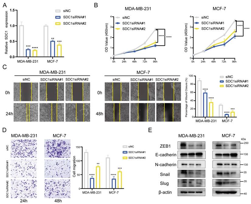Effects of SDC1 silencing on the growth and migration of breast cancer cells. (A) Detection of SDC1 mRNA knockdown by RT-qPCR. (B) Growth curves of MDA-MB-231 and MCF-7 cells with SDC1 knockdown as evaluated by the CCK8 assay. (C and D) The scratch (C) and transwell (D) assays demonstrating the effects of SDC1 inhibition on cell migration. (E) The detection of EMT-associated proteins after SDC1 knockdown.
