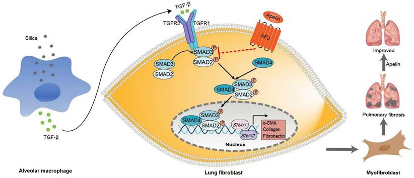 Schematic representation of the mechanism by which apelin alleviates the progression of silica-induced pulmonary fibrosis. During silica-induced pulmonary fibrosis, alveoli macrophages are activated by inhaled silica particles and release TGF-β. After binding with TGF-β, the TGF-β receptor is activated, resulting in the phosphorylation of SMAD2 and SMAD3. The phosphorylated SMAD2 and SMAD3 form the SMAD complex with SMAD4 and translocate to the nucleus to trigger target gene transcription, including transcription factors SNAI1 and SNAI2 and consequently the continuous expression of ECM proteins, such as fibronectin and collagen I. Apelin binding to and activating APJ inhibits the phosphorylation of SMAD2/3 and the expression of SNAI1 and SNAI2, suppresses lung fibroblast activation and ECM production triggered by TGF-β, thus alleviates pulmonary fibrosis.