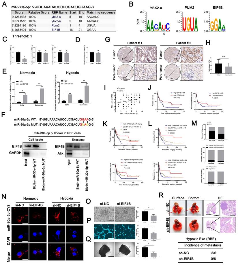 EIF4B modulated packing of miR-30a-5p into exosomes. A, B A specific interaction between the miR-30a-5p sequence and RBP motifs was predicted based on RBPDB analysis. C Exosomal miR-30a-5p expression secreted from CCA cells with YBX2-a, PUM2 and EIF4B silencing was detected by qRT-PCR. D MiR-30a-5p expression level in CCA cells with EIF4B silencing was detected by qRT-PCR. E RIP assays with anti-EIF4B antibody (IgG used for control) were performed on the cell or exosomal lysates from CCA cells under nomoxic or hypoxic condition. MiR-30a-5p levels in immunoprecipitated samples were determined by qRT-PCR and were calculated as percentages in respect to the input sample (% input). F MiR-30a-5p pulldown assay was performed in RBE cell lysate and the corresponding exosomes, then the enriched proteins were detected by western blotting. G H Representative images of distinct intensity of EIF4B expression based on IHC and the score of high/low EIF4B level in tumor and their corresponding para-tumor tissues were shown, the scores were calculated by intensity and percentage of stained cells. I The correlation of EIF4B and miR-30a-5p was analyzed based on IHC. J Kaplan-Meier curves for OS and RFS of ICCA patients with high/low EIF4B was shown. K L Kaplan-Meier curves for OS and RFS of ICCA patients combined with miR-30a-5p/EIF4B and MVD/EIF4B was shown. M Parameter analysis of ICCA patients with high/low EIF4B based on TMA IHC was shown. N CCA cells were transfected with miR-30a-5p-CY3 and subjected to nomoxia or hypoxia, then CCA cells-released exosomes were harvested and incubated with HuVECs for 48h. Fluorescence microscopy was used to detect red fluorescent signals in HuVECs. O 3D sprouts, P tube formation and Q aortic ring assays were performed to probe the effect of EIF4B on angiogenesis. R The effect of EIF4B on metastasis was analyzed based on lung metastasis model. *P < 0.05, **P < 0.01, ***P < 0.001.