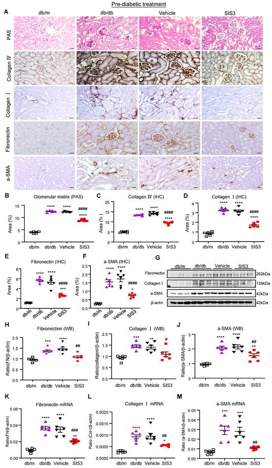 Prediabetic treatment of db/db mice with SIS3 from the age of 4 weeks to 12 weeks protects against renal fibrosis. (A) PAS and immunostaining with antibodies against collagens I and IV, fibronectin (FN), and α-SMA in the week 12 kidney of db/m and db/db mice treated with or without SIS3 at a dose of 2.5 mg/kg/day. (B-F) Semi-quantitation of glomerular matrix deposition and accumulation of collagens I, IV, fibronectin, and α-SMA+ myofibroblasts from the immunostained sections. (G-J) Western blotting and quantitative analysis of renal fibrosis including collagen I, α-SMA, and fibronectin. (K-M) Real-time PCR analysis for mRNA expression of fibronectin, collagen I, and α-SMA in the kidney of db/m or db/db mice at 12 weeks. Data represents the mean ± SEM for at least 6 mice per group. **P<0.01, ***P<0.001, ****P<0.0001 versus normal db/m mice. #P<0.05, ##P<0.01, ###P<0.001, ####P<0.0001 compared with the control-treated db/db mice (vehicle). SIS3 dosages used: SIS3 =SIS3 2.5 mg/kg.bw. Scale bar, 50μm.
