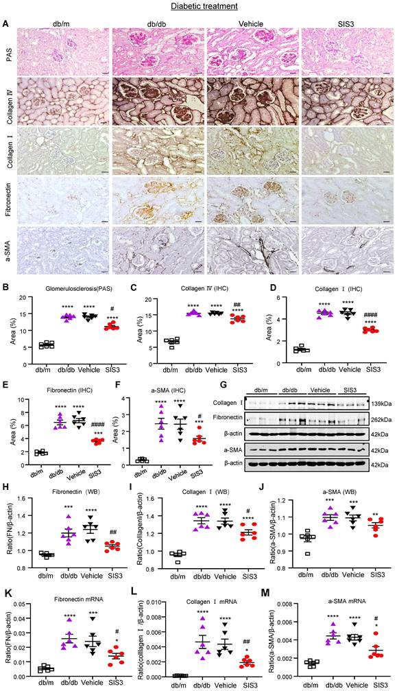 Treatment with SIS3 in db/db mice from the age of 8 weeks to 16 weeks significantly inhibits renal fibrosis in db/db mice. (A) PAS and immunostaining with antibodies against collagens I and IV, fibronectin, and α-SMA in the kidney of db/m and db/db mice treated with or without SIS3 at a dose of 2.5 mg/kg/day. (B-F) Semi-quantitation of glomerular matrix deposition and accumulation of collagens I, IV, fibronectin, and α-SMA+ myofibroblasts from the immunostained sections. (G-J) Western blotting and quantitative analysis of renal fibrosis including collagen I, α-SMA, and fibronectin. (K-M) Real-time PCR analysis for mRNA expression of fibronectin, collagen I, and α-SMA in the kidney of db/m or db/db mice at the age of 16 weeks. Data represents the mean ± SEM for at least 6 mice per group. *P<0.05, **P<0.01, ***P<0.001, ****P<0.0001 versus normal db/m mice. #P<0.05, ##P<0.01, ####P<0.0001 compared with the control-treated db/db mice (vehicle). SIS3 dosages used: SIS3=SIS3 2.5 mg/kg.bw. Scale bar, 50μm.