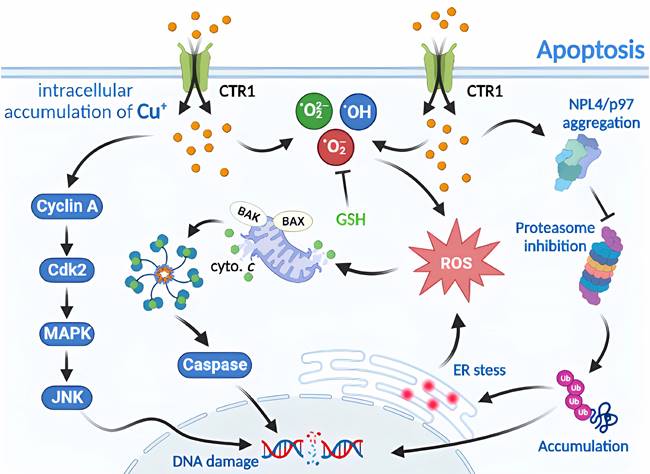 Molecular mechanisms of apoptosis triggered by excess Cu. Excess Cu is transported into cells via the Cu transporter, CTR1, resulting in a significant buildup of intracellular super radicals. This accumulation triggers cyclin A/Cdk2/MAPK/JNK activity and induces mitochondrial stress, causing the translocation of pro-apoptotic proteins (such as BAX and BAK) to the outer mitochondrial membrane. This event leads to the release of cytochrome c and the formation of apoptosome, which activates caspases and contributes to DNA damage. Cu also facilitates NPL4/p97 polymerization and inhibits the proteasome, leading to enhanced endoplasmic reticulum stress and ultimately resulting in apoptosis.