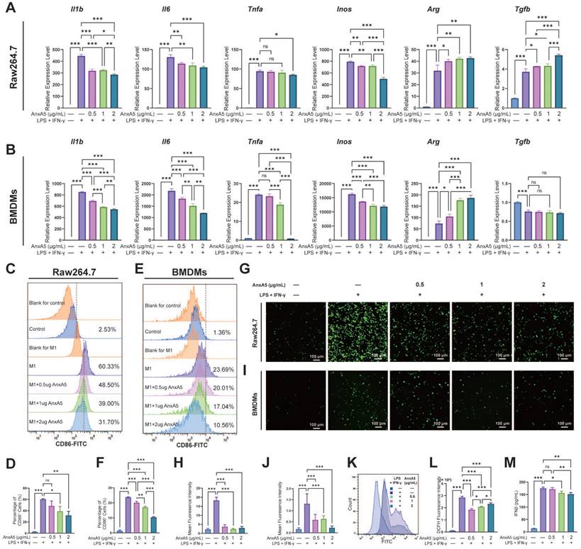 AnxA5 Suppresses M1 Macrophage Polarization. A, B. Raw264.7 cells and BMDMs were exposed to 1 μg/mL LPS and 30 ng/mL IFN-γ, then treated with different concentrations of AnxA5 (0.5, 1, 2 μg/mL) for 48 hours and 6 hours, respectively. The mRNA levels of Il1b, Il6, Tnfa, Inos, Arg and Tgfb were determined by qRT-PCR, showing a decrease in the expression of M1-associated inflammatory mediator genes in both cell types. C, D. Analysis of CD86 flow cytometry data revealed a decrease in the percentage of M1-like cells in the Raw264.7 cell model following AnxA5 treatment. The numbers on the graph represented the mean from three experiments. E, F. Analysis of CD86 flow cytometry data revealed a decrease in the percentage of M1-like cells in the BMDMs cell model following AnxA5 treatment. The numbers on the graph represented the mean from three experiments. G, H. Representative images of Raw264.7 cells stained with DCFH-DA, and the mean fluorescence intensity was quantified. I, J. Representative images of BMDMs stained with DCFH-DA were analyzed for mean fluorescence intensity. K, L. Flow cytometry results and quantification of mean fluorescence intensity in Raw264.7 cells. M. IFN-β levels in the supernatant of BMDMs cell culture were measured using ELISA. Scale bars were noted on the right bottom corner of each image. Data presented as mean ± standard deviation (n=3 per group). *p < 0.033; **p < 0.002; ***p < 0.001; ns, not significant.