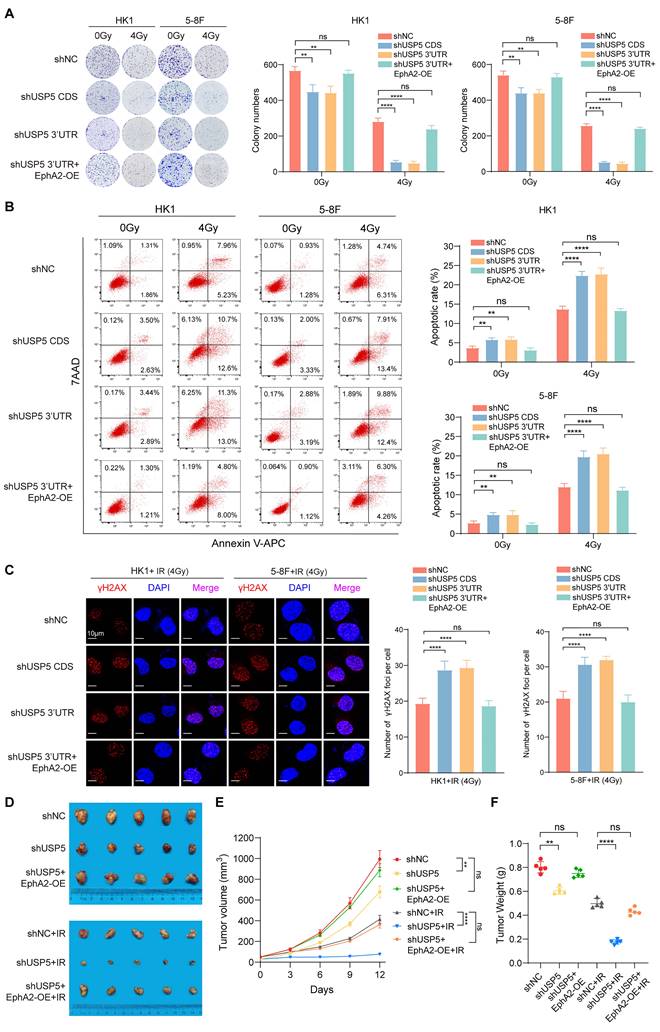 USP5 increases in vitro and in vivo NPC cell radioresistance through EphA2 mediation. (A) Clonogenic survival assay showing the radiosensitivity of HK1 and 5-8F NPC cells with USP5 knockdown or USP5 knockdown and EphA2 overexpression (OE). Cancer cells were exposed to 4 Gy ionizing radiation (IR), and colonies that formed after incubation of 12 days were stained with crystal violet. Representative images are shown on the left, and quantitative data are presented on the right. Cells without irradiation served as control. (B) Flow cytometric analysis showing the irradiation-induced apoptotic rate of HK1 and 5-8F NPC cells with USP5 knockdown or USP5 knockdown and EphA2 OE. 48 hours after 4Gy IR, cell apoptosis was detected. Representative results are shown on the left, and quantitative data are presented on the right. Cells without irradiation served as control. (C) Immunofluorescent staining showing the irradiation-induced γH2AX focus number of HK1 and 5-8F NPC cells with USP5 knockdown or USP5 knockdown and EphA2 OE. 4 hours after 4Gy IR, γH2AX foci were detected. Representative images are shown on the left, and quantitative data are presented on the right. (D) Xenografts showing the in vivo radiosensitivity of 5-8F NPC cells with USP5 knockdown, 5-8F NPC cells with USP5 knockdown and EphA2 overexpression and shNC control cells. The photographs (left), growth curves (middle) and weight (right) of xenograft tumors 12 days after initial radiotherapy. 7 days after the inoculation, tumor-bearing mice received a total of 12Gy IR, and radioresponse was estimated after initial treatment. Xenografts without irradiation served as control. shUSP5, knockdown of USP5 by shRNA; EphA2-OE, EphA2 overexpression. **, P < 0.01; ****, P < 0.0001; ns, no significance.
