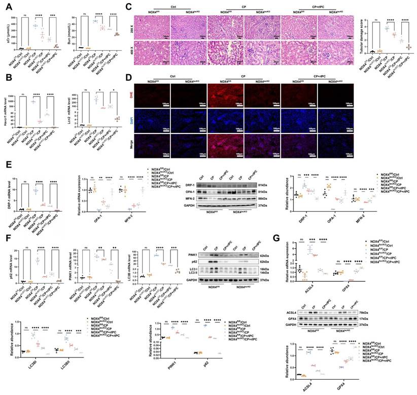 The protective effects of rIPC on AKI mice are enhanced by NOX4 knockout. (A) sCr and BUN levels in difference groups of CP-AKI mice. (B) Havcr1 and Lcn2 expression measured by RT-qPCR in CP-AKI mouse kidney. (C) Representative image of hematoxylin and eosin (H&E) staining in CP-AKI mouse kidney (200x, scale bar = 50μm; 400x, scale bar = 20 μm). (D) ROS assessed by DHE staining in CP-AKI mouse kidney (200x, scale bar = 100 μm). (E) Mitochondrial dynamic regulatory molecules (DRP-1, OPA-1 and MFN-2) analyzed by RT-qPCR, western blot and quantified by densitometry in CP-AKI mouse kidney. (F) Mitophagy level (PINK1, p62/SQSTM1 and LC3B) analyzed by RT-qPCR, western blot and quantified by densitometry in CP-AKI mouse kidney. (G) Ferroptosis-regulatory molecules (ACSL4 and GPX4) assessed by RT-qPCR, western bolt and quantified by densitometry in CP-AKI mouse kidney. Data are presented as mean ± SD, n = 6. rIPC: remote ischemic preconditioning, CP: cisplatin, Lcn2: (neutrophil gelatinase-associated lipocalin, NGAL) and Havcr1: (kidney injury molecule 1, KIM1), ROS: reactive oxygen species. *p<0.05, **p<0.01, ***p<0.001, ****p<0.0001, #p<0.05, ##p<0.01, ###p<0.001, ####p<0.0001, ns: no significant.