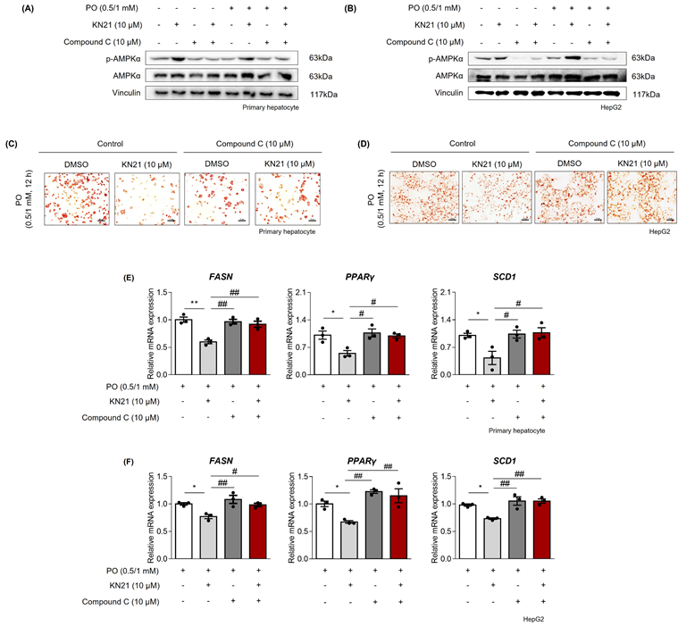 To confirm that the lipid-lowering effects of KN21 are mediated through AMPK activation, hepatocytes were co-treated with KN21 and Compound C, an AMPK inhibitor. Compound C significantly inhibited KN21-induced AMPK phosphorylation in PO-stimulated hepatocytes (Fig. 5A and B). Oil red O staining revealed that while KN21 effectively reduced lipid accumulation in PO-treated primary hepatocytes and HepG2 cells, this effect was reversed in the presence of Compound C (Fig. 5C and D). Furthermore, KN21 treatment significantly reduced intracellular TG levels; however, this lipid-lowering effect was abolished in the presence of Compound C (Fig. S9B). Similarly, Compound C abrogated the KN21-induced downregulation of fatty acid synthesis-related genes, including FASN, PPARγ, and SCD1 (Fig. 5E and F). These findings confirm that the lipid-lowering effects of KN21 in hepatocytes under metabolic stress are dependent on AMPK activation.